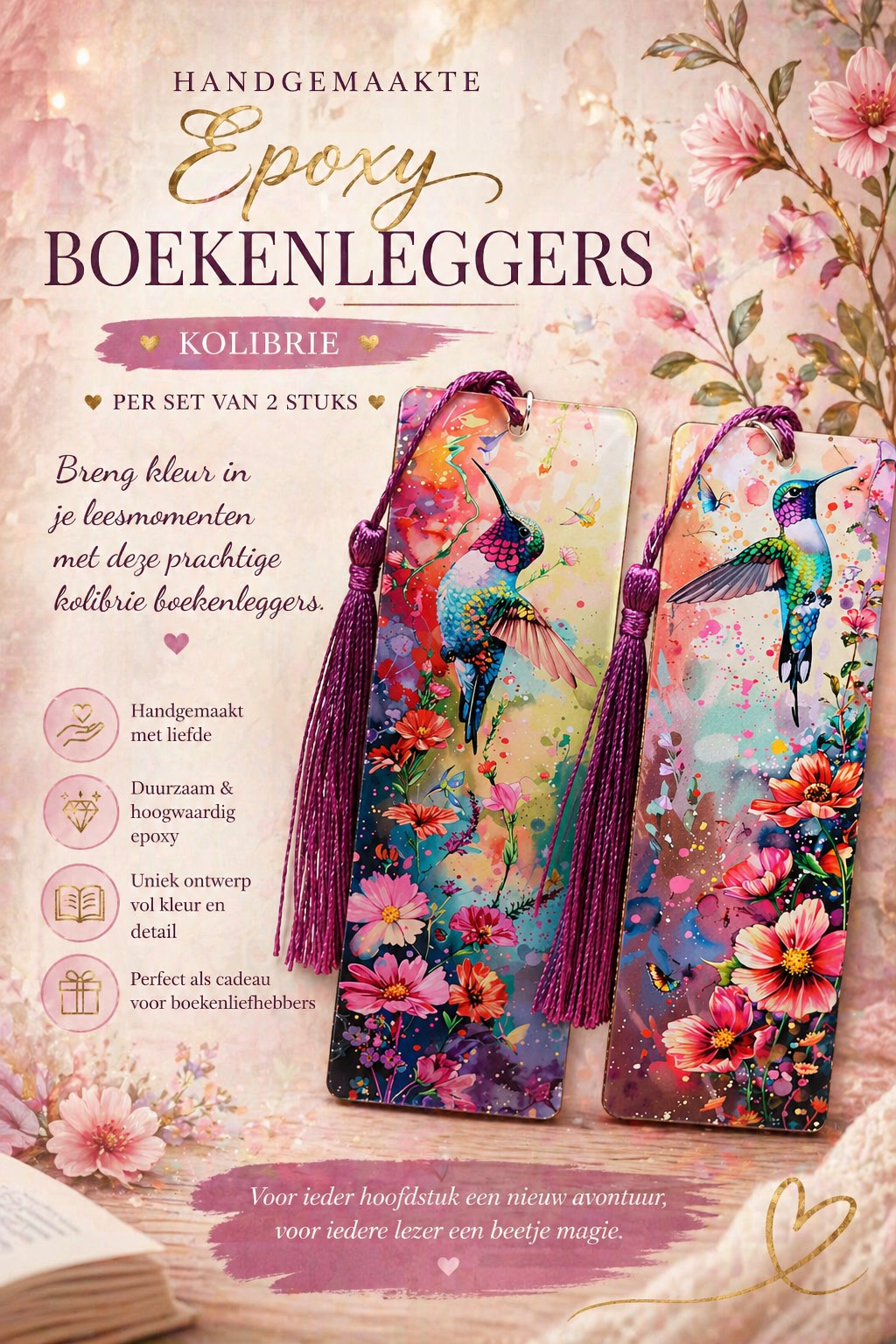 Waarom kiezen als je ze allebei kunt hebben? Deze unieke set van twee handgemaakte epoxy boekenleggers brengt kleur en glans aan elk verhaal. Of je nu twee boeken tegelijk leest of er eentje cadeau geeft aan je favorietje leesmaatje. Duurzaam,glashelder en met liefde gegoten-een sieraad voor tussen je bladzijden.